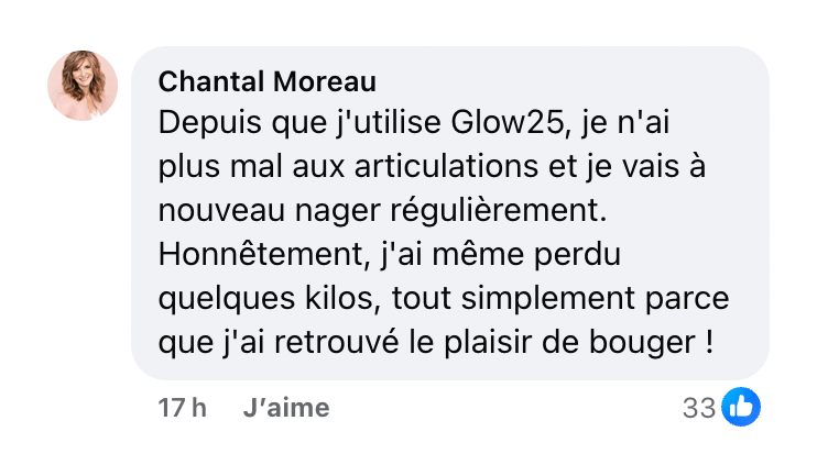« Avant, je devais me « dérouiller » pendant plusieurs minutes avant que mes genoux ne fonctionnent à moitié. Après environ six semaines avec Glow25, je me lève le matin – sans craquement, sans tiraillement. C’est pour moi une pure qualité de vie. »